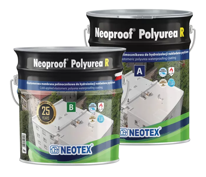 Neoproof Polyurea R to dwuskładnikowa, zimno nakładana membrana hydroizolacyjna do dachów, tarasów i balkonów. Jest odporna na deszcz po 1 godzinie, tworzy trwałą, elastyczną powłokę chroniącą przed wilgocią, UV i uszkodzeniami. Posiada ETA 24/1247 oraz klasę trwałości W3, gwarantując żywotność do 25 lat. Odporna na przerastanie korzeni, certyfikowana Broof (t1) i wyróżniona jako „Cool Material” zmniejszający nagrzewanie powierzchni.