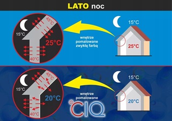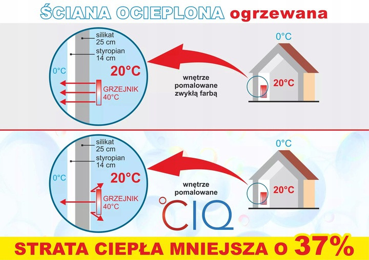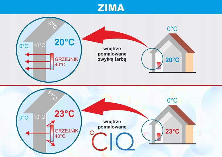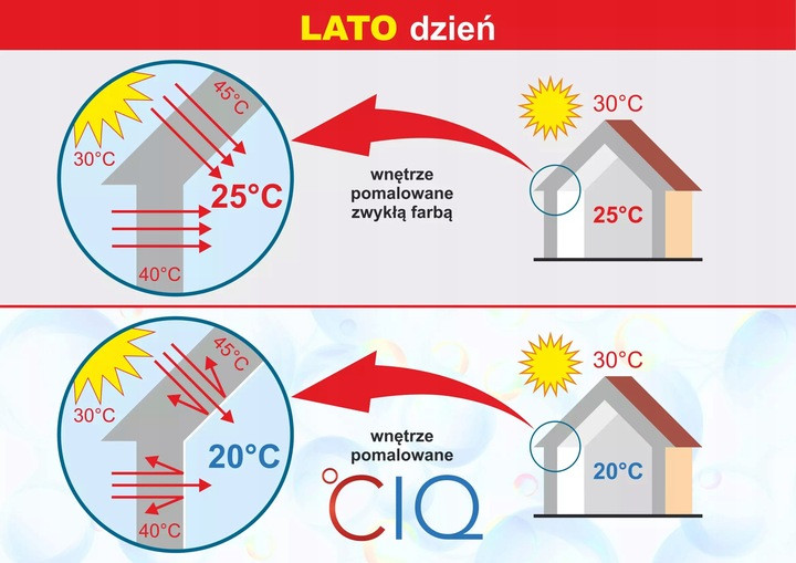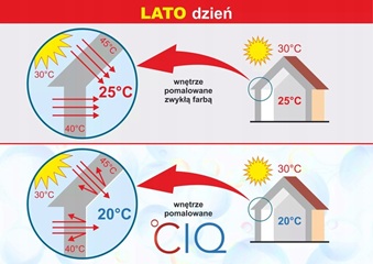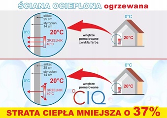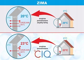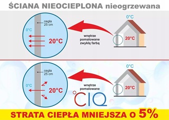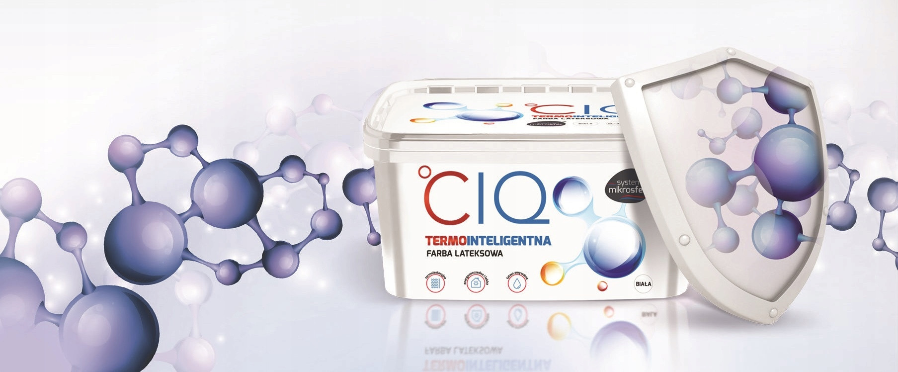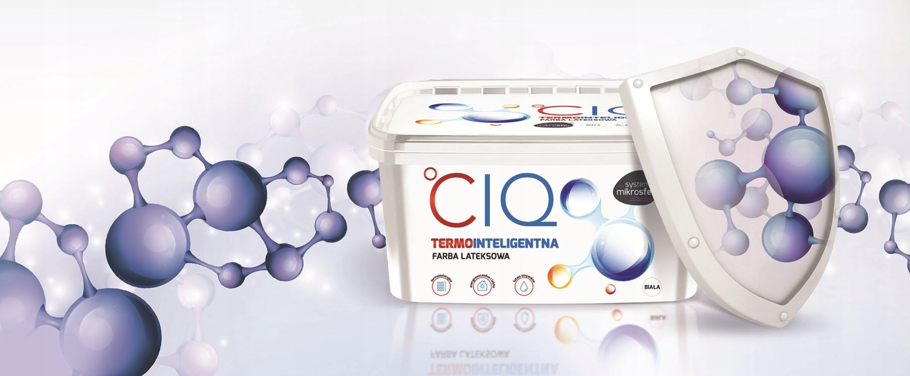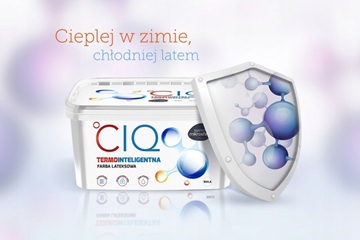 Farba lateksowa °CIQ to nowoczesna, specjalistyczna powłoka o właściwościach termoizolacyjnych, przeznaczona do aplikacji wewnętrznej. Formuła produktu oparta jest na zaawansowanym systemie mikrosfer polimerowych wypełnionych gazem obojętnym, które skutecznie odbijają do 95% promieniowania cieplnego. Dzięki temu farba ogranicza straty energii cieplnej zimą oraz minimalizuje nagrzewanie się powierzchni ścian latem.
